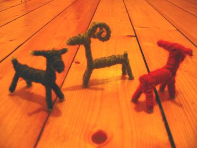 Da jeg var i Gøteborg i helgen falt jeg pladask for noen yndige små julebukker i en design- og interiørforretning. De var uforholdsmessig dyre, så geitene ble foreviget i smug med mobilkamera. Vel hjemme gikk jeg til innkjøp av piperensere og ullgarn, og her er resultatet: