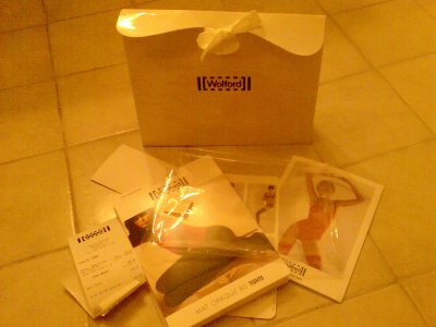 3) Et stykke kartong som var brettet rundt strømpebuksen, med størrelsesinformasjon og vaskeanvisning (OK, ganske nyttig), og flere bilder av produkter fra Wolford.