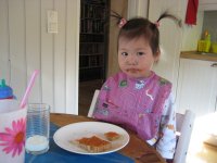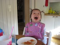 (I virkeligheten er de tatt i går. I dag tidlig sov hennes mor langt over frokost. For å opprettholde en nesten 20 år lang tradisjon som består i å stille på Youngstorget i nokså redusert forfatning, tok jeg minst to øl for mye på Oslo Mek i går. Og forbannet regnværet i dag, fordi det utelukket bruk av solbriller.)