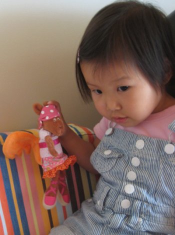 Men så viser det seg at jeg ikke kan huske hvem som ga henne dette ekornet. Jeg tror (håper) det skyldes at hun fikk det sammen med noe annet, som jeg husker. (Jeg er egentlig ganske flink til å huske sånt.) Ekornet har rosa espadrillos, orange hale, og en mønstret kjole som matcher det hele. Er det noen som vil vedkjenne seg det?